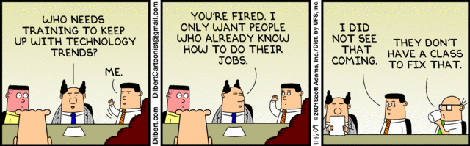 Dilbert.com via Dangerously IrrelevantThat's my fundamental concern here. IT Departments, through with the best of intentions, have become a cop out. Schools are not really serious about large scale, systemic, technology-based reforms; they are just serious enough to let someone else worry about it for them, though. And, as long as IT departments continue to be that responsibility write-off, I don't think we can ever get to systemic changes to reorient our schools to the new economy.