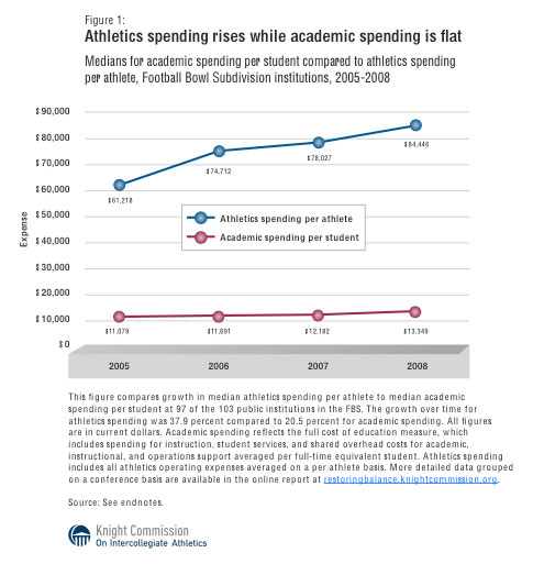 Of course, this report comes on the heels of several others that also make me question the feasibility of continuing down our current path in college athletics. Take, for instance, this report out a couple months ago on the growing disparity in atheltic and academic spending. The following chart tells a pretty stark story. And, that's not to even mention the recent seismic shifts in the major college athletic conferences all in the pursuit of an extra couple million dollars. And, before you go thinking I am anti-UK basketball or anything, UK athletics donates millions each year to our academic budget and on top of that I am a huge Wildcats fan.